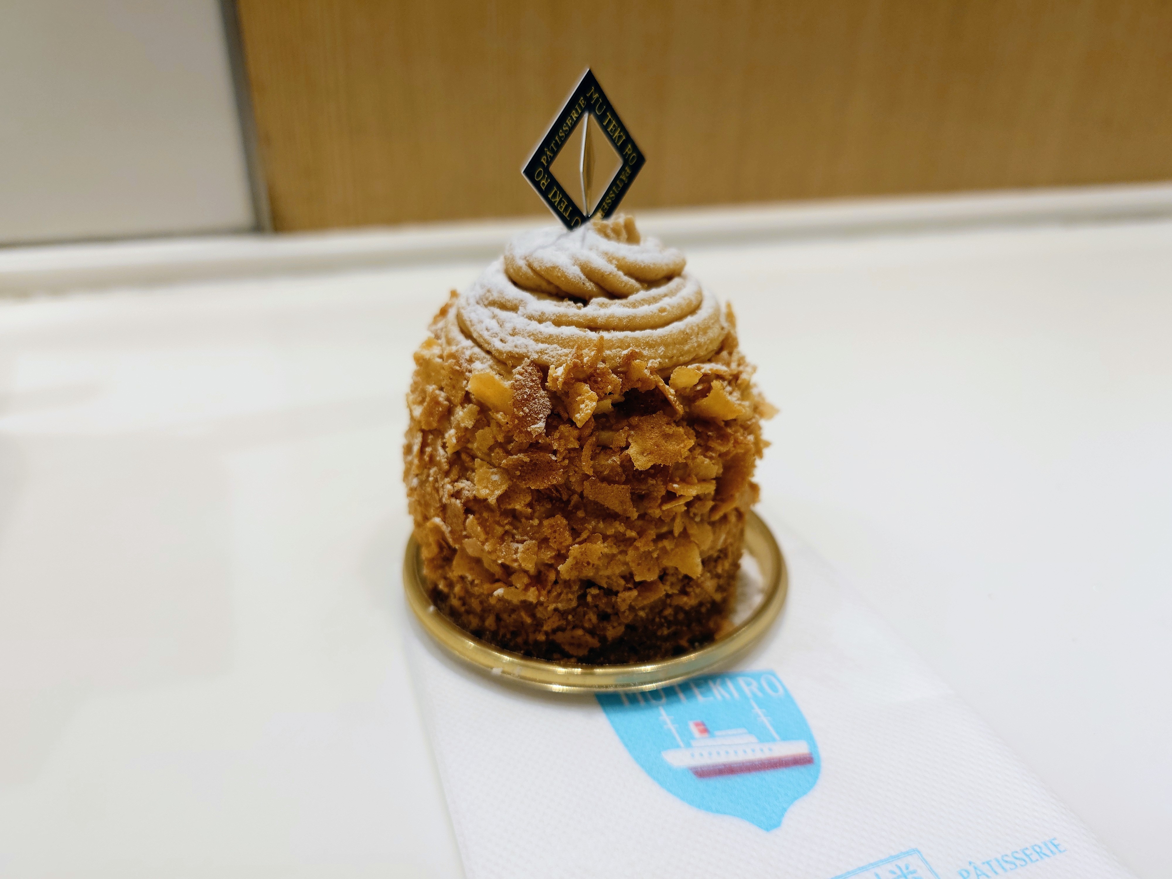 そしてその下にはスポンジを挟んでミルククリームとクッキーをクラッシュしたものが敷かれてるんですが、ん?塩?そう、このミルククリームとクッキーには若干の塩味があるんです。これがすごいいいアクセントになっています。そしてクッキーのザクザクとした食感。これもすごくWowがあります。すべてを一口に口に運んだときに、色んな甘さや香りが鼻から抜けると同時にザクザク感と塩味が、食感と風味においていいバランスをとることに貢献しています。